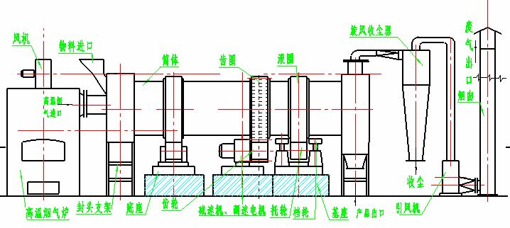 干燥的濕物料由皮帶輸送機(jī)或斗式提升機(jī)送到料斗,然后經(jīng)料斗的加料機(jī)通過加料管道進(jìn)入加料端。加料管道的斜度要大于物料的自然傾角,以便物料順利流入干燥器內(nèi)。干燥器圓筒是一個(gè)與水平線略成傾斜的旋轉(zhuǎn)圓筒。物料從較高一端加入,載熱體由低端進(jìn)入,與物料成逆流接觸,也有載熱體和物料一起并流進(jìn)入筒體的。隨著圓筒的轉(zhuǎn)動(dòng)物料受重力作用運(yùn)行到較底的一端。濕物料在筒體內(nèi)向前移動(dòng)過程中,直接或間接了載熱體的給熱,使?jié)裎锪系靡愿稍?,然后在出料端?jīng)皮帶機(jī)或螺旋輸送機(jī)送出。在筒體內(nèi)壁上裝有抄板,它的作用是把物料抄起來又撒下,使物料與氣流的接觸表面增大,以提高干燥速率并促進(jìn)物料前進(jìn)。載熱體一般分為熱空氣、煙道氣等。載熱體經(jīng)干燥器以后,一般需要旋風(fēng)除塵器將氣體內(nèi)所帶物料捕集下來。如需進(jìn)一步減少尾氣含塵量,還應(yīng)經(jīng)過袋式除塵器或濕法除塵器后再放排放。