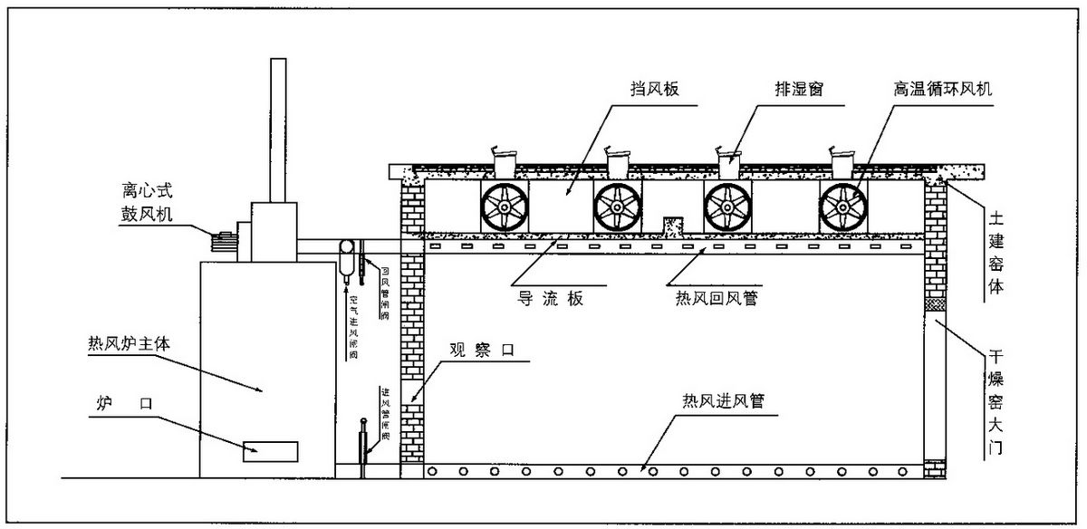 熱風(fēng)式干燥設(shè)備工作原理是利用燃燒產(chǎn)生的熱能,加熱窯內(nèi)的空氣,由熱風(fēng)爐頂部主風(fēng)機(jī)將窯內(nèi)的空氣通過管道吸入爐體,將空氣加熱。再通過管道,送入窯內(nèi),由窯內(nèi)的循環(huán)風(fēng)機(jī)不斷的循環(huán)對窯內(nèi)的木材均勻加熱。木材干燥過程中如需要蒸汽,可由熱風(fēng)爐內(nèi)的蒸汽發(fā)生器提供,如果是一爐兩房或多房時,管道上裝有插閥,通過插閥的調(diào)節(jié)來控制窯內(nèi)的溫度。在干燥的過程中,由于木材要進(jìn)行排濕,在窯頂上留有排濕孔(根據(jù)地區(qū)而定)和裝有抽濕機(jī),用來調(diào)節(jié)排濕的快慢.